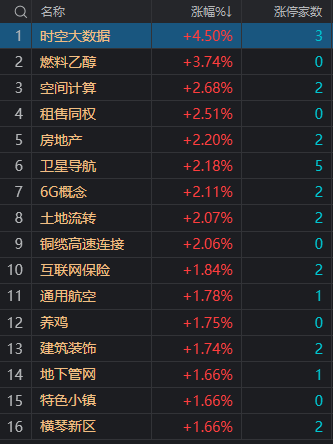 盘面上,地理信息概念股集体上涨,飞利信、测绘股、航宇微均20CM涨停。商业化航天概念股持续活跃,航天晨光、腾达科技、中国卫通涨停。铜缆高速连接概念股再次上涨,胜蓝股份上涨10%以上,沃尔核材、神宇股权双双再创历史新高。低空经济概念股反弹,本川智能、中信海直线涨停。房地产股在收盘前拉涨,空港股权,新黄浦涨停。下跌方面,家电股集体调整,海信家电下跌超过5%。板块方面,时空大数据、房地产、铜缆高速连接、卫星导航等板块涨幅居前,轨道交通设备、家电、汽车、白酒等板块跌幅居前。
