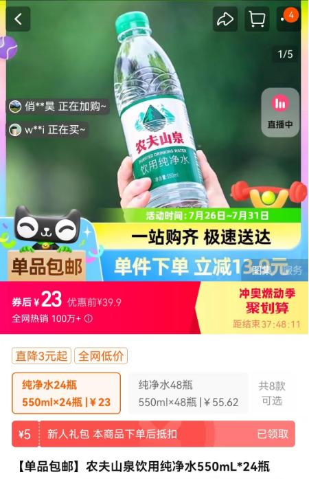 这瓶水上市后,价格和红瓶一样。但是随着夏天的到来,很多超市的绿瓶纯净水开始打折,有的甚至低到8毛钱以下。零售圈查看某宝自营店出售的农夫山泉绿瓶水。24罐的价格只有23元,一瓶不到1元。