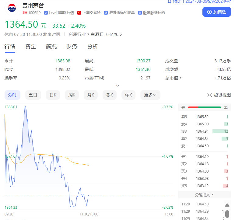 今天上午a股市场整体低位波动,上证指数盘中一度创下近5个月新低,随后跌幅收窄。其中,贵州茅台跌幅超过2%,年内创下新低。