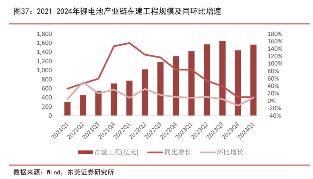 就产能提升节奏而言,2023年Q4开始锂电池产业链在建工程规模有所下降,但规模仍然较大。