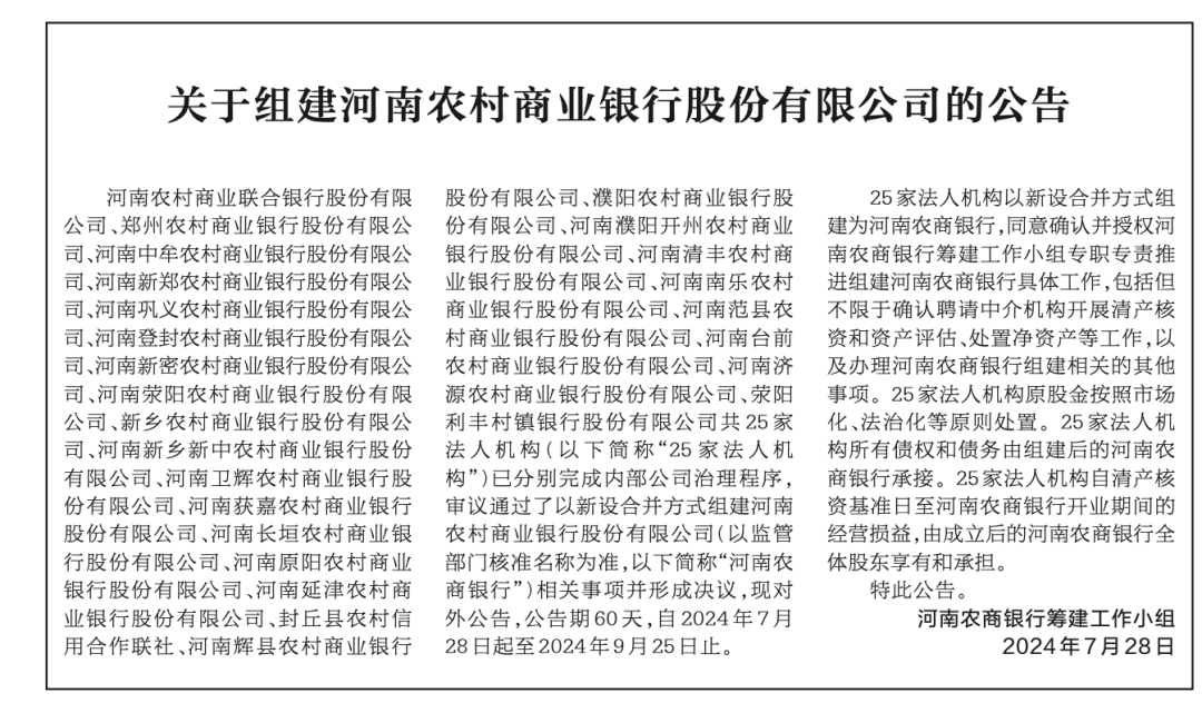7月28日, 河南农村商业银行《河南日报》上刊登了筹备工作小组《 关于建立河南农村商业银行有限公司的通知》称,本省 25家法人机构内部公司治理程序已分别完成,审议通过。 河南农村商业银行股份有限公司通过新的合并方式建立(以监督机构批准的名称为准, 下面简称河南农商银行)有关事项和决定的形成。