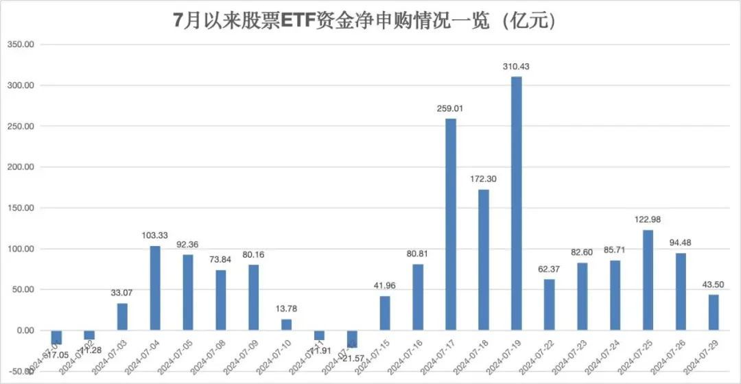 根据银河证券基金研究中心的数据,截至7月29日,全市907只股票ETF总量已达2.11万亿元。7月29日,ETF股市总份额增长38.07亿份,净流入资金约为43.50亿元,按区间平均成交价格计算。