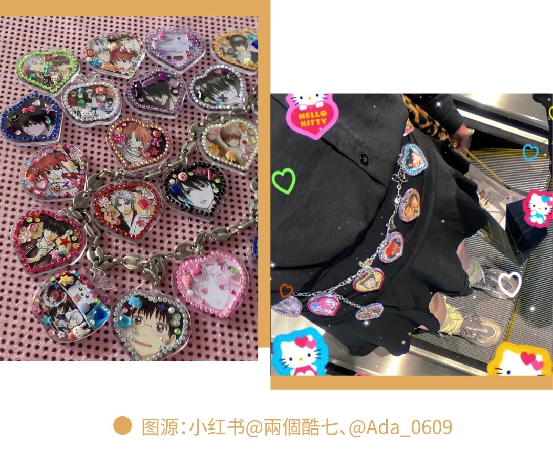 花里胡哨的贴纸一粘上,乱七八糟的吊坠一扣上,一条专属的痛链就诞生了。有了它,你可以获得双倍的快乐:你不仅可以挂一条腰带炫耀你爱的人,还可以呼应你的衣服,无痛地变成千禧潮女y2k辣妹。