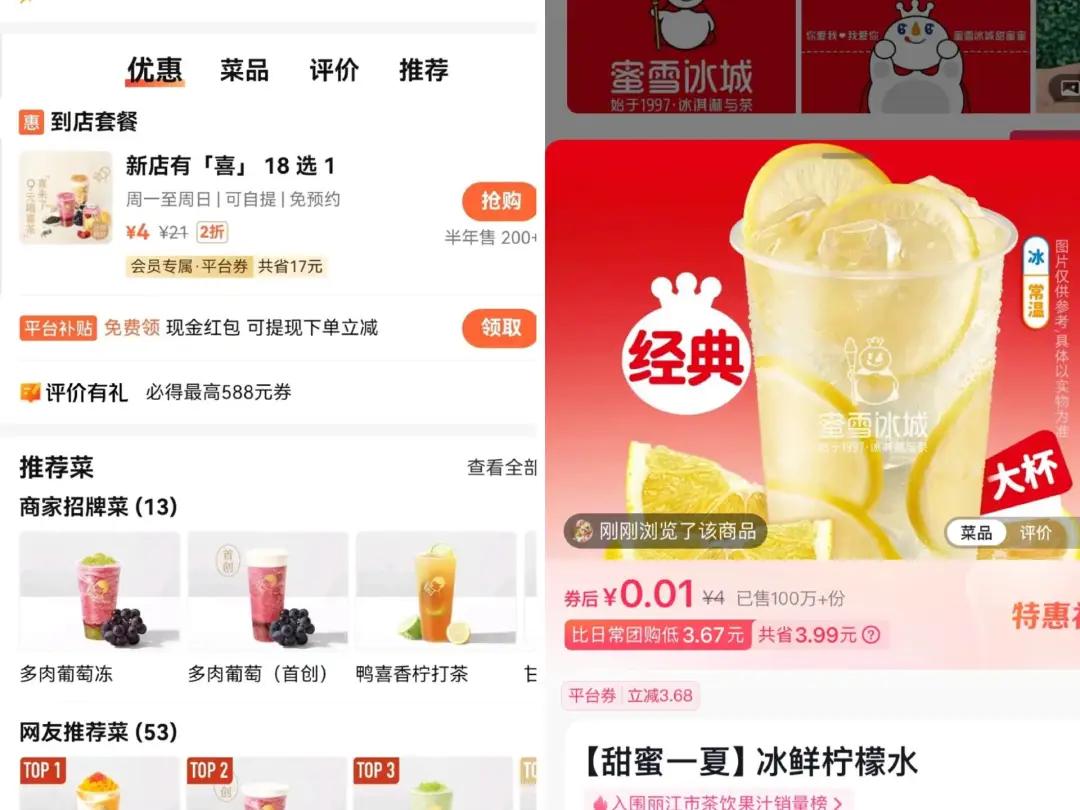 此外,原本被称为性价比的蜜雪冰城和茶百道的价格还有探索的余地。夏季回归茶百道的青梅绿茶,叠加平台券和折扣后,价格只有6.9元。蜜雪冰城的招牌柠檬汁叠加平台折扣后,价格甚至不到1元。