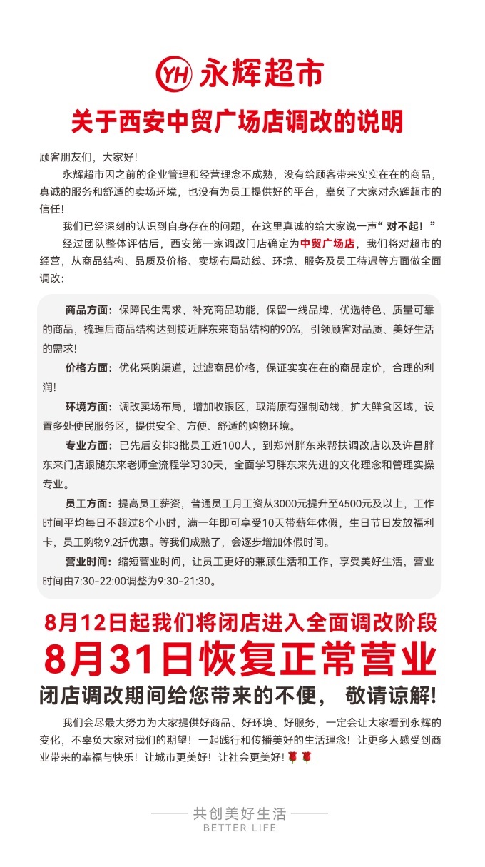 永辉全国第一家自主调整店即将关闭店铺调整。