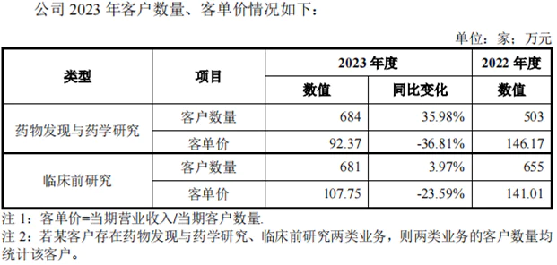 首先,美迪西在6月20日回复上海证券交易所年报询价公告时指出,由于生物医药行业投融资热度下降,市场需求发生变化,行业竞争加剧。为了争取市场业务机会,公司积极降低部分订单业务价格,与前一年相比,订单价格普遍大幅下降。例如,2023年药物发现与药学研究平均客户单价同比下降36.81%。