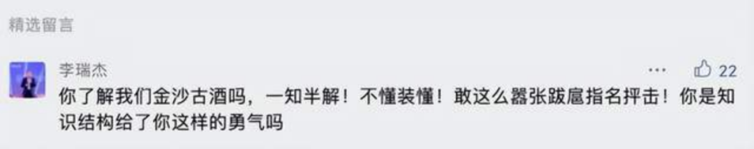 李瑞杰留言评论道,“您知道我们的金沙古酒吗,一知半解!不知道怎么装懂!敢于如此嚣张跋扈地批评!您是否有勇气获得知识结构?”