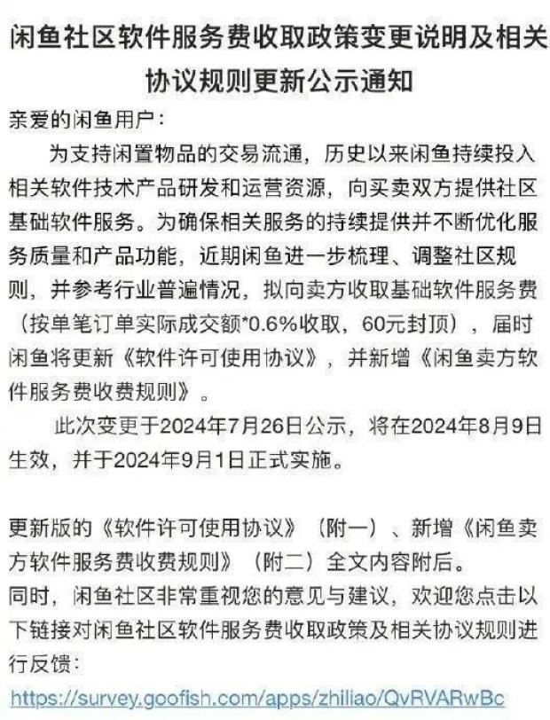 7月26日,闲鱼宣布将向所有商家收取0.6%的基本软件服务费(每笔最高收取60元)。同时,对于同一个自然月产生的交易订单数量超过10个,累计交易金额超过1万元的商家,软件服务费将收取超过每个订单实际交易金额的1%。