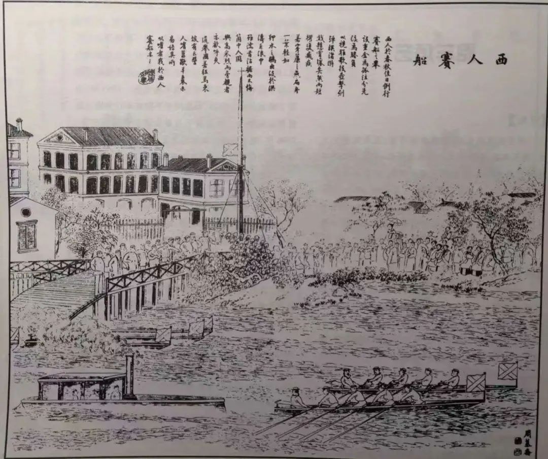 1872年9月20日,《申报》报道了当时比赛的盛况:“1:30,八人打桨之舟,共有两艘,激浪如飞,排桨连击...3:00,四人打桨之舟,3:3:30,一人打桨之舟。赢家积极奔跑,西方妇女乐此不疲,享受更多乐趣……”