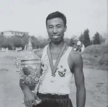 1959年,在第一届全国运动会上,上海划船队拥有4枚男子项目金牌。图为程骏迪手持奖牌。