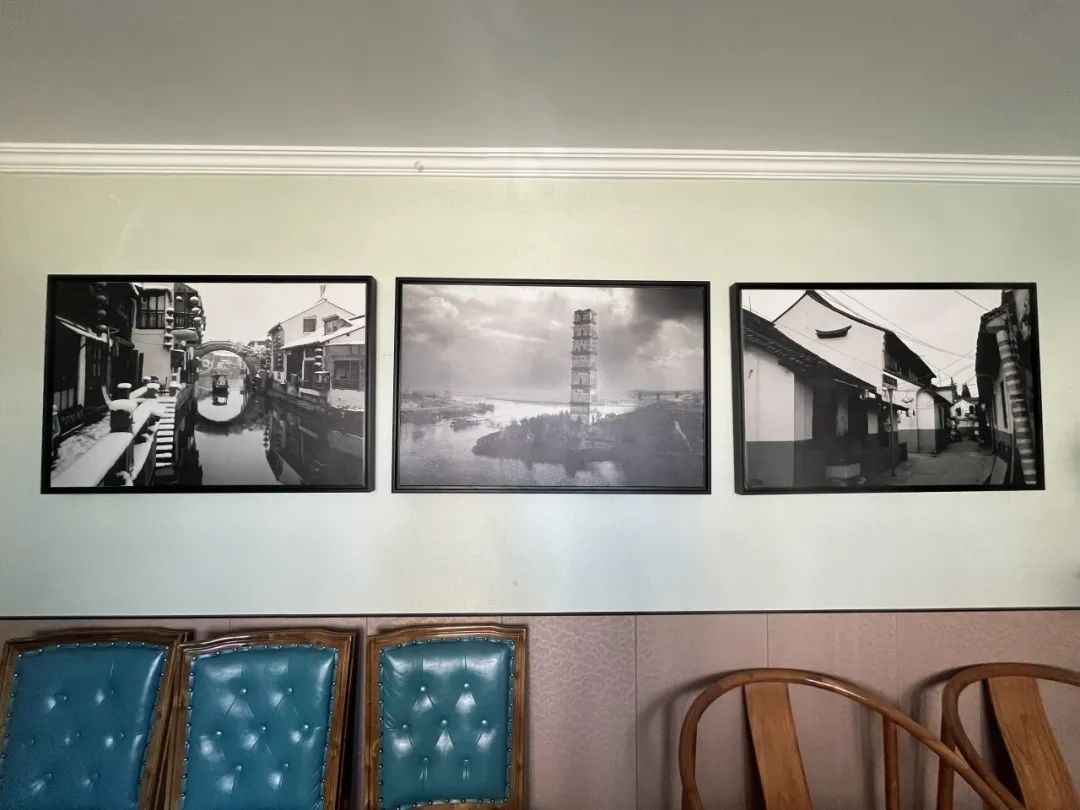 餐厅墙上斑驳的老照片吸引了很多顾客去了解。优雅的店铺环境与老照片相得益彰,透露出古色古香的气息。据悉,这些老照片是店主身边的朋友拍的。出于摄影爱好,老青浦的原始地貌和文化习俗一一展现出来。
