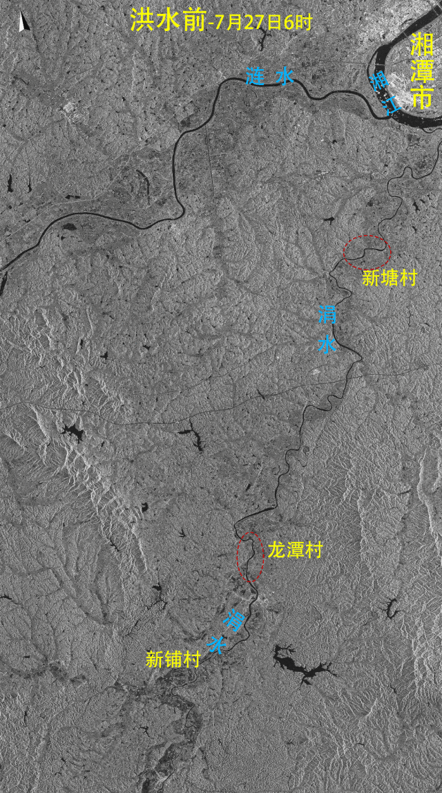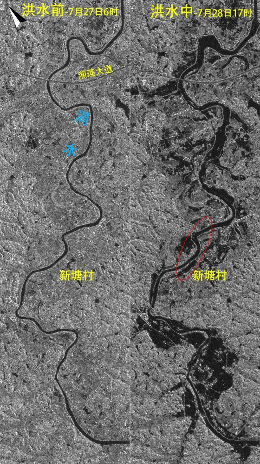 在上图中,7月28日图像中涓水沿岸的黑色区域是由强降水和河水暴涨溢出形成的存水区域。新塘村、龙潭村、新铺村属于涓水河沿岸存水严重的地区。