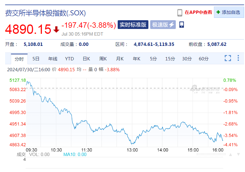 在美国股市中,值得注意的是半导体板块下跌,费城半导体指数下跌3.88%。