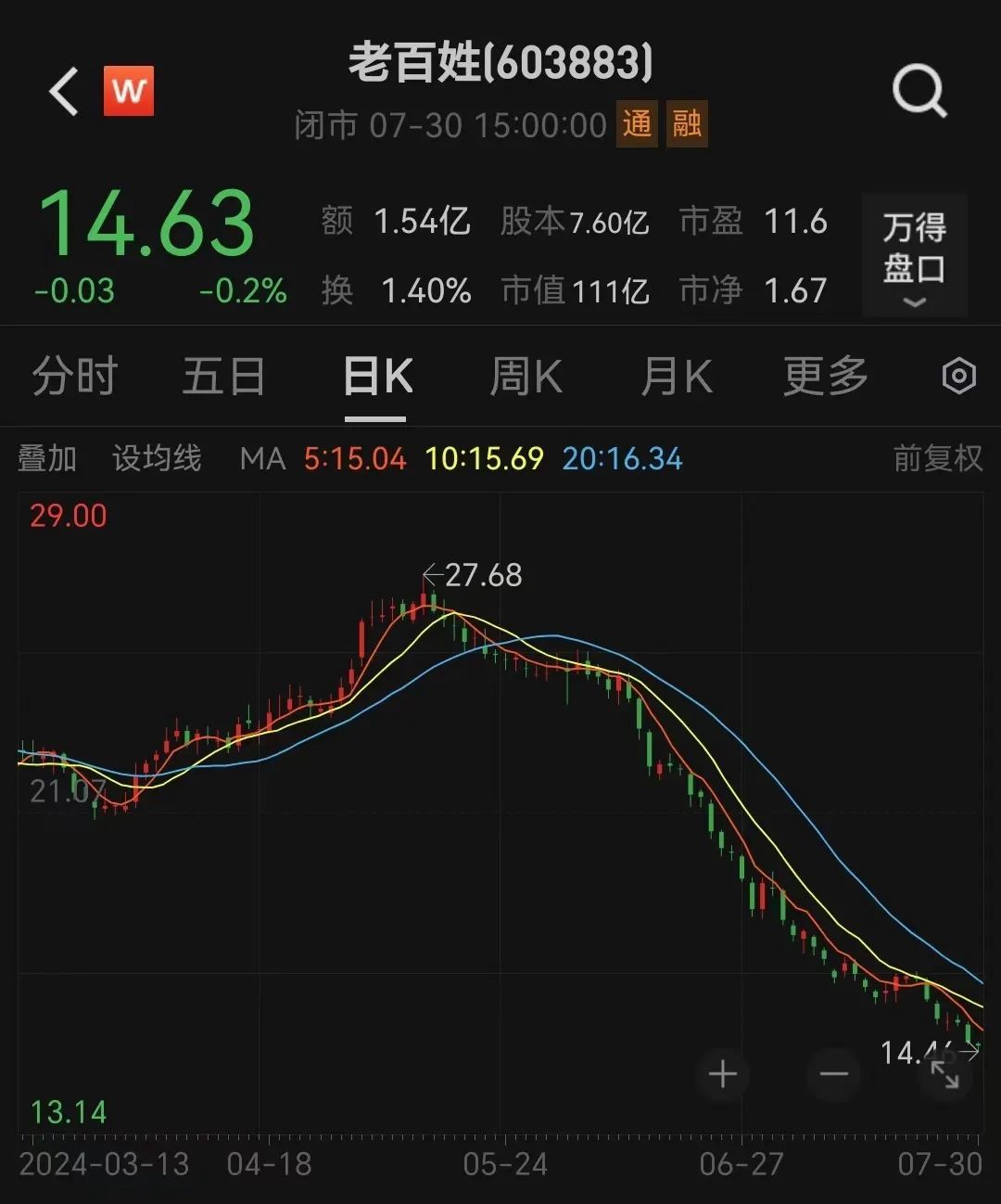 七月三十日,普通百姓股价收于14.63元,跌幅为0.2%,最新市值为111亿元。