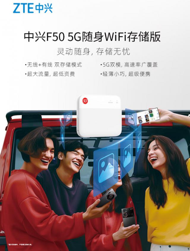 据报道,中兴 F50 5G 随身 WiFi 存储版自带 256GB 存储空间,支持最大 2TB microSD 内存卡扩展,可充当随身 U 盘子使用。另外,该随身携带。 WiFi 还支持无线 有线存储,使用者可以通过访问 WiFi 也可以通过上传文件 USB 直接连接有线上传。