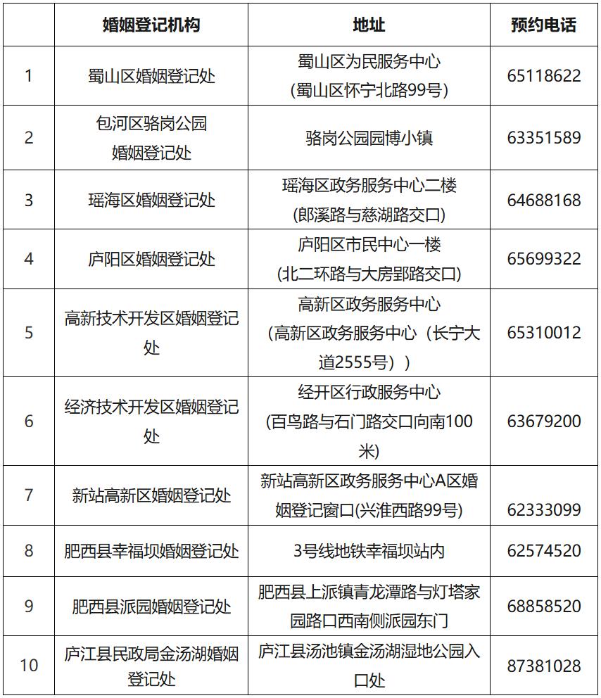 合肥市县(市)区结婚登记机构名单