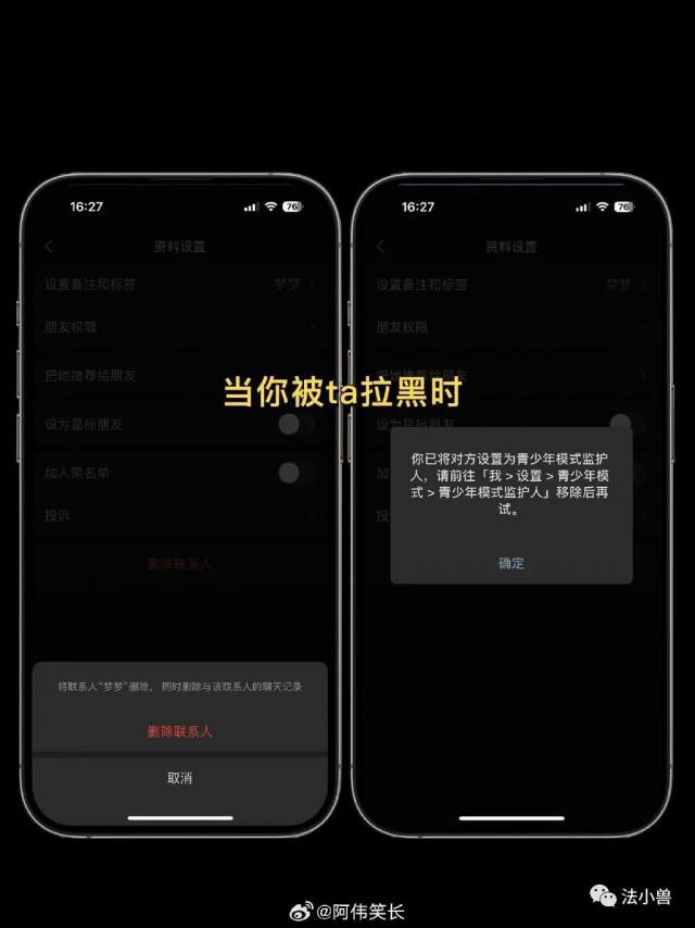 如果你想在设置后将监护人列入黑名单或删除对方,系统会提示你已经将对方设置为青少年模式监护人,而不是将对方列入黑名单或删除对方。