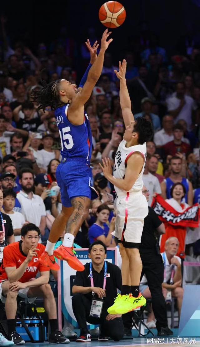 下半场,日本率先用力打球。 8-2 超越比分,此后双方进行拉锯战,比分交替领先,法国一波 7-0 占据主动,69-64 法国领先 5 分,