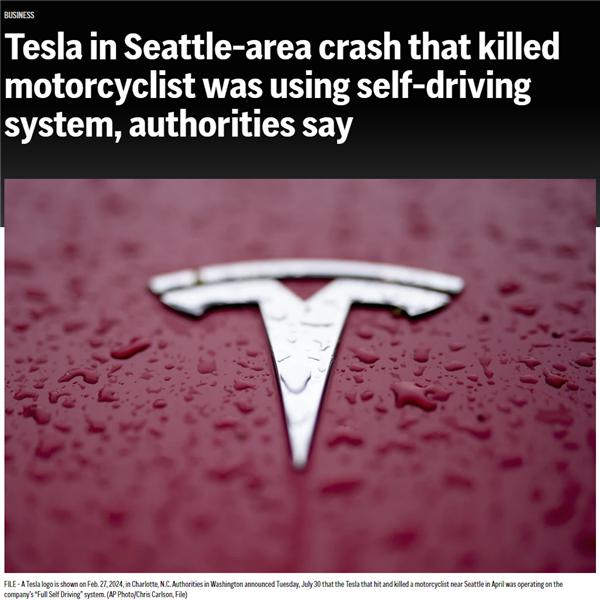 快科技 7 月 31 日本消息,美国华盛顿州政府周二表示,今年已确定 4 在西雅图发生事故的特斯拉正处于“ FSD “完全自动驾驶”(Full Self Driving)模式中,据报道,这次事故导致一名摩托车骑手被撞死。