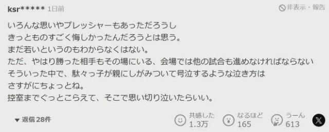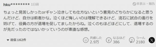 有的看不下去 or 哇,我忍不住哭了。我知道它会成为两种观点中的哪一种,但我选择了前者。我能理解后悔哭了,但毕竟阻碍了比赛的进行,工作人员也催促我离开。如果你想哭,你应该掌握分寸。你不是先离开吗?这是我直截了当的感受。