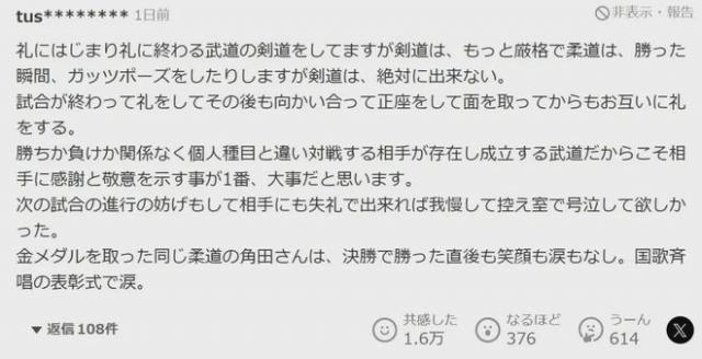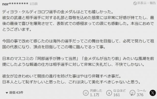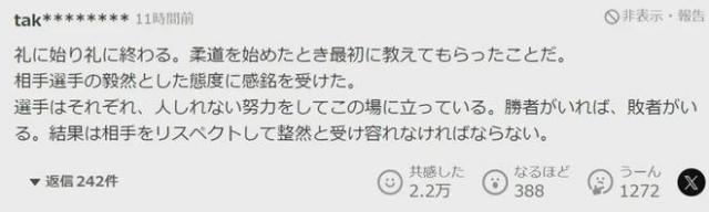 尽管媒体竭尽全力煽情,积极报道,但事情过去只是过去。 24 小时候,阿部诗的网络风评依然急转直下。归根结底,日本人真的懂得柔道。