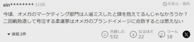 现在这个时候,欧米茄市场部正在为人选失误头疼吗?第二场输了,哭了的柔道家不认为她符合欧米茄的品牌形象。
