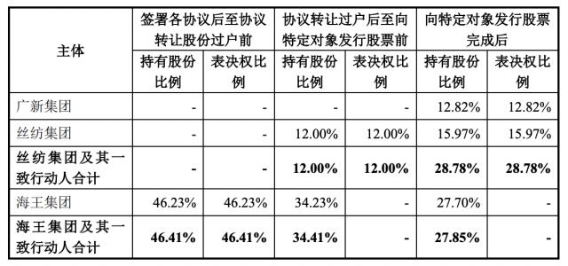 本次交易完成后,丝纺集团及其一致行动人将共同持有海王生物 28.78% 股权正式成为海王生物的控股股东。与此同时,海王集团及其三位一致行动人签署了放弃投票权的协议,放弃了相应的投票权,约占公司总股权。 为丝纺集团的实际控制地位铺平了道路,32.91%。