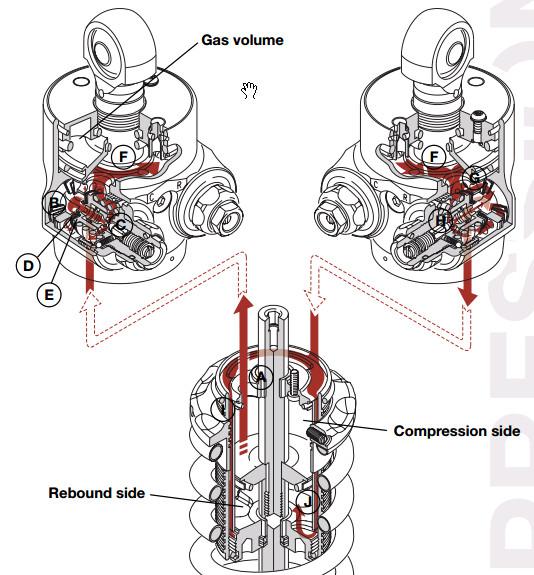 TTX 是 Ohlins 著名的双筒减振器型号,设计十分精巧,下图为 TTX 压缩(红色)、回弹(蓝色)行程中减震油流向示意图。
