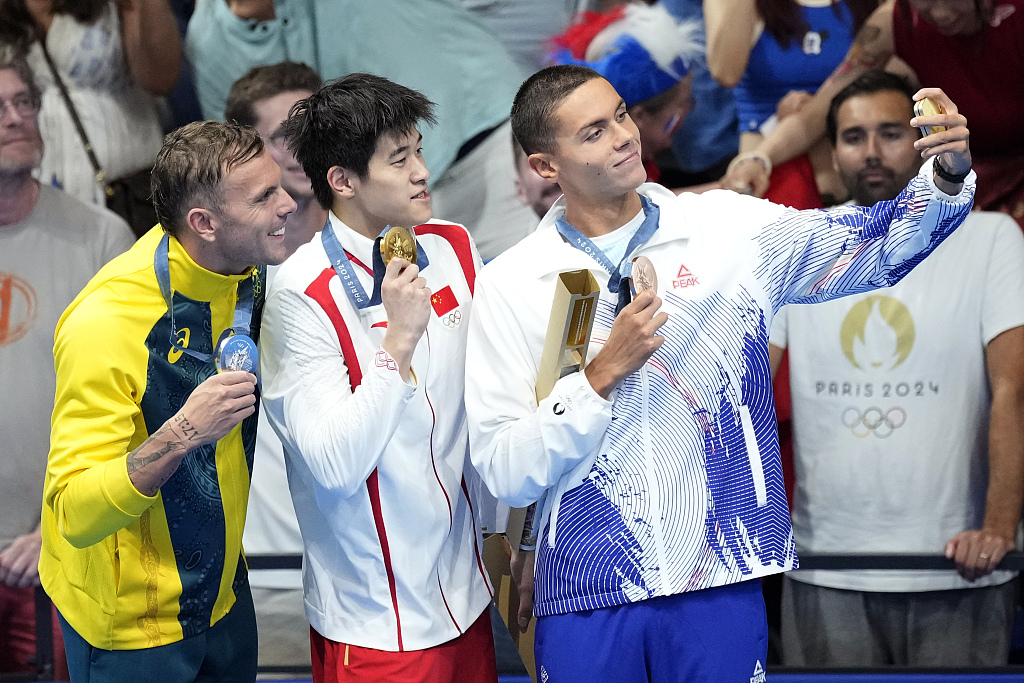比赛结束后,当现场广播宣布潘展乐获得金牌时,观众爆发出欢呼声。此外,获得100米自由泳第二名的澳大利亚选手查尔莫斯还主动伸出手,在领奖台上与潘展乐互动并表示祝贺。