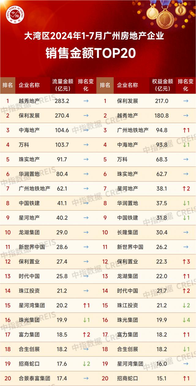 2024年1-7月,大湾区广州房地产企业销售业绩排行榜