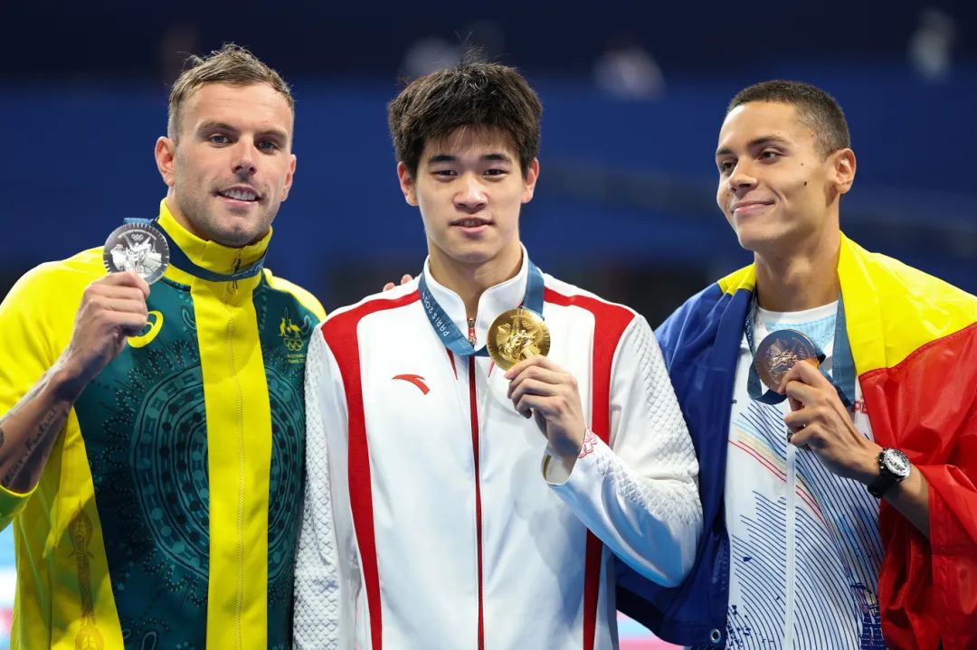 当地时间7月31日,中国冠军选手潘展乐(中国)、亚军澳大利亚球员查默斯(左)和季军罗马尼亚球员波波维奇在颁奖典礼上。图/视觉中国