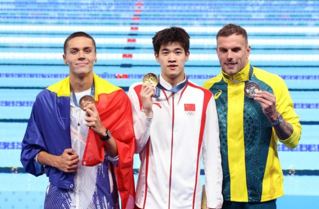 ↑中国冠军选手潘展乐(中国)、在颁奖典礼上,亚军澳大利亚选手查默斯(左)和季军罗马尼亚选手波波维奇。新华社记者 雒圆 摄