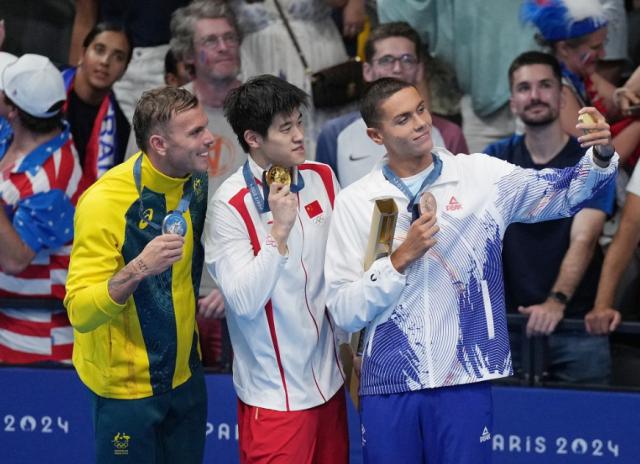 ↑中国冠军选手潘展乐(中国)、在颁奖典礼之后,亚军澳大利亚选手查默斯(左)和季军罗马尼亚选手波波维奇。新华社记者 雒圆 摄