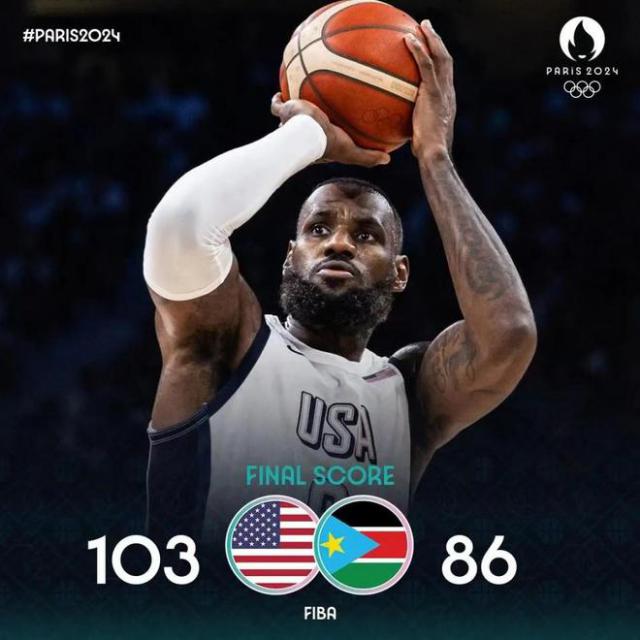北京时间 8 月 1 日本,巴黎奥运男篮预选赛,美国男篮卫冕冠军 103-86 击败南苏丹男篮,美国男篮获胜 2 连胜提前锁定奥运会八强。詹姆斯奥运会总分突破 300 分为美国男篮历史第一 3 人类,也是奥运会历史第一 5 位置助攻数突破 100 第二个球员创造纪录。