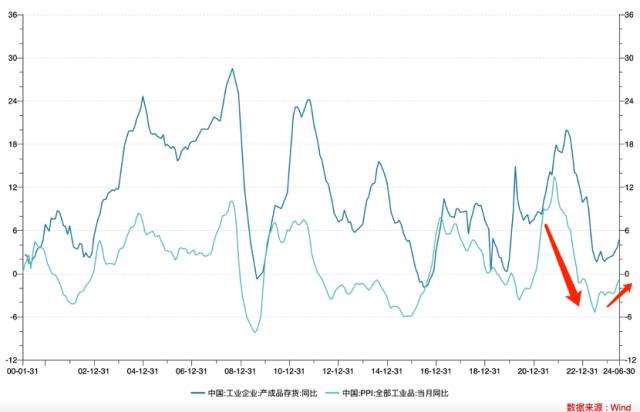 自 2021 到目前为止,我们国家经历了一轮非常强大的去库存工作,PPI 与库存同比下降,但是,2024 2008年至今,上图两条曲线都出现了明显的筑底迹象,第二季甚至出现了双双向上的趋势。
