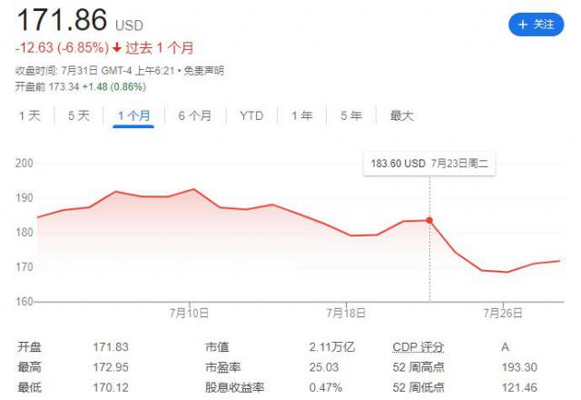 公布财务报告后,谷歌盘中一度下跌超过 3% 之后反弹,最后盘后涨幅超过。 2%。截至撰稿,谷歌股价为 171.86 与财报发布当日盘后股票下跌相比,美金 6.3%,市值 2.11 亿美元。