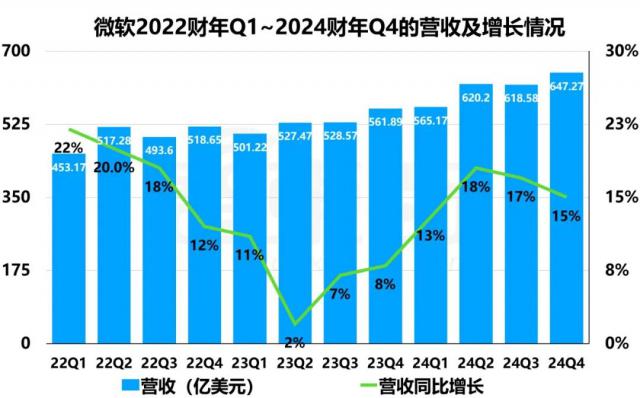 微软在 2024 财年 Q4(对应自然年 2024 年 Q2)的收入是 647.27 亿美元,同比增长 15%,略高于预期。 644.76 亿美金。