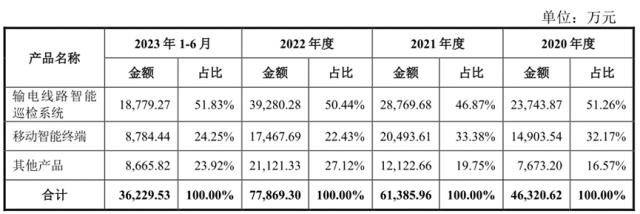 2020 年 -2023 年 6 月份,信通电子的主营业务收入分别为 4.63 亿元、6.14 亿元、7.79 亿元及 3.62 亿元。其中,电力线路智能巡检系统是信通电子最重要的收入来源,业务收入占公司各期总收入的比例。 51.26%、46.87%、50.44%、51.83%。