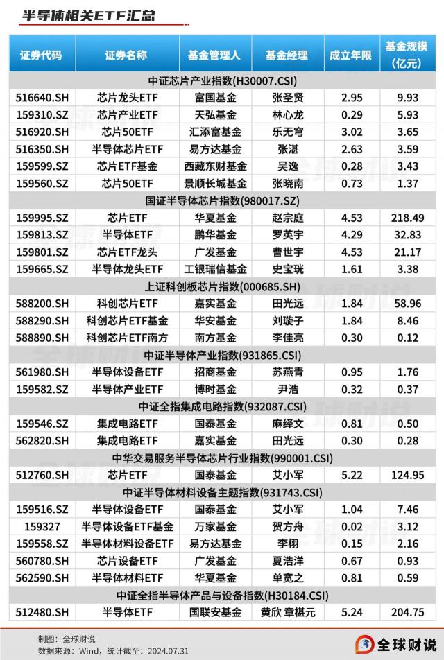 如上图所示,目前整个市场跟踪上述指数的半导体相关性 ETF 基金共 24 只是,因为跟踪同一指数。 ETF 业绩差距比较有限,《全球财说》的选择 3 只有代表性的 ETF 进行分析,供投资者选择。