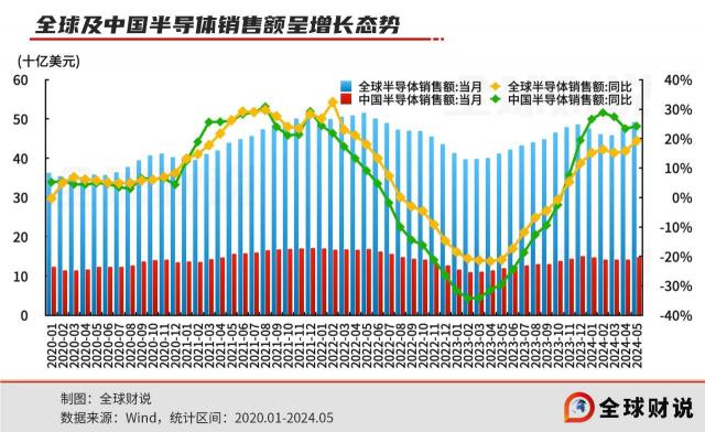 细化数据后,2024 年 1-5 月份,全球半导体销售额同比增长 15.2%、16.3%、15.2%、15.8%、19.3%;中国半导体销售额分别同比增长 26.6%、28.8%、27.4%、23.4%、24.2%。