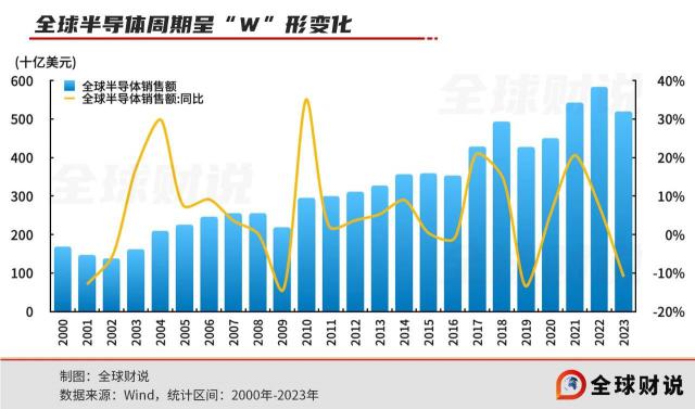 从下面全球半导体销售情况的图表可以看出,目前正处于半导体周期铺垫的新一轮阶段,即“ W “类型的初始形态。