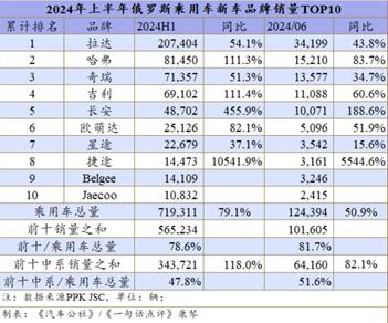 根据俄罗斯汽车工业分析机构 Autostat,2024 今年上半年,中国汽车品牌在俄罗斯的销售额是多少? 41.75 万台,占比达到 58%。PPK JSC 数据显示,上半年俄罗斯市场销量继续同比大幅增长 79.1% 至 71.9 哈佛、奇瑞、吉利、长安四大巨头万台,位居万台。 2-5 名。