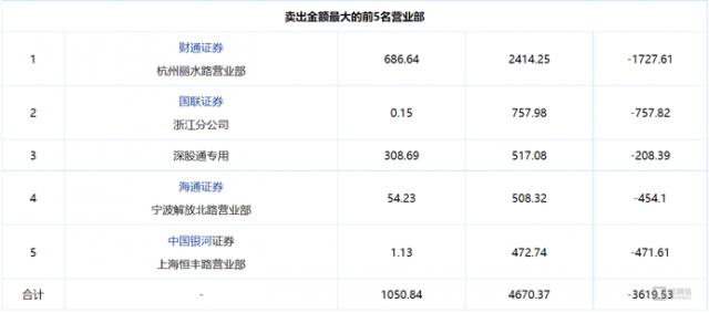 24 日龙虎榜显示,卖方前 5 有 3 浙江营业部、财通证券杭州丽水路营业部、国联证券浙江分公司、海通证券宁波解放北路营业部。