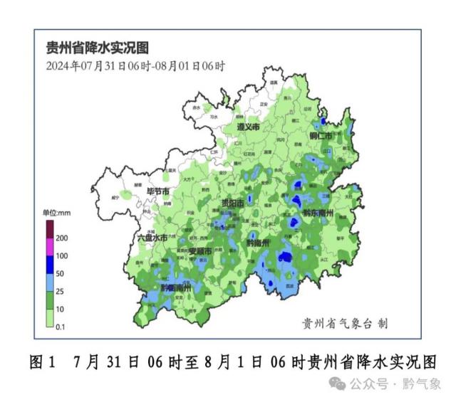 7 月 31 日 06 时至 8 月 1 日 06 当时贵州省渗透性大到暴雨,安顺市平坝、紫云、贵阳市开阳、花溪、观山湖、铜仁市印江、松桃、石建、黔东南州凯里、台江、施秉、雷山、黄平、黔南三都、平塘、独山、罗甸、荔波、贵定、安龙,贞丰,黔西南州 21 个县域内的 37 三都县最大的观测站是中合县。 93.3 mm,暴雨有 244 一个观测站,大雨以上的降水主要在铜仁市北部、黔东南州中北部、黔南州南部和中部、贵阳市南部、安顺市南部和黔西南州之间。有 43 个县 ( 市、区 ) 出现 108 车站短时强降水,松桃县永安最大小时雨强。 66.3 mm ( 7 月 31 日 15 时至 16 时 ) 。