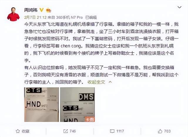 2019 春节期间,当周鸿祎从日本JD.COM飞往北海道滑雪时,他和其他游客拿错了行李箱,并在朋友圈和微博上发布了自己的搜索通知。这一事件很快引起了媒体的关注。