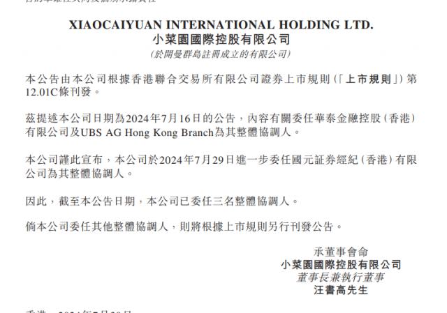 截至目前,小菜园已任命华泰国际、瑞银、国元证券为其整体协调人员。