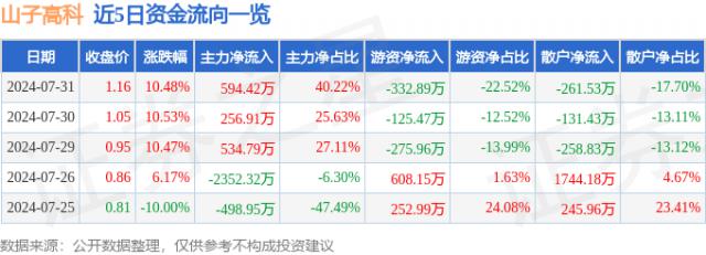 7 月 31 在日资金流入数据方面,主要资金净流入 594.42 一万元左右,约占成交额 游资资金净流出40.22% 332.89 一万元左右,约占成交额 散户资金净流出22.52% 261.53 一万元左右,约占成交额 17.7%。