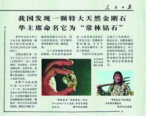 1977 每年冬天,山东省蒙阴县常林大队的农民魏振芳,像往常一样在田间劳作。锄头突然遇到一块硬东西,魏振芳低头一看,发现了一块闪亮的石头。魏振芳兴奋地把这块石头带回了村里,村民们都围了过来,看着新奇。每个人都认为这可能是一块晶石。这个消息很快传到当地的地质部门。经过仔细鉴定,专家们惊讶地发现,这实际上是一个重约。 158.786 裸钻克拉!这种钻石之所以被称为“常林钻石”,是因为它是常林大队发现的。常林钻石材质干净透明,呈淡黄色,八面晶形完美。这个发现不仅让常林大队名声大噪,也让大家知道山东蒙阴蕴含着如此宝贵的资源。如今,常林钻石作为我国的重要财富,在国家银行的金库中得到了妥善的收藏。