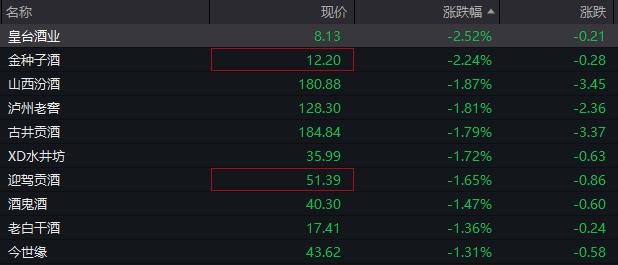 白酒股也纷纷回调,金种子酒、山西汾酒跌幅超过 2%,古井贡酒、泸州老窖股份有限公司、水井坊、酒鬼酒等多芯跌幅超过 1%。贵州茅台正在下跌 1%。
