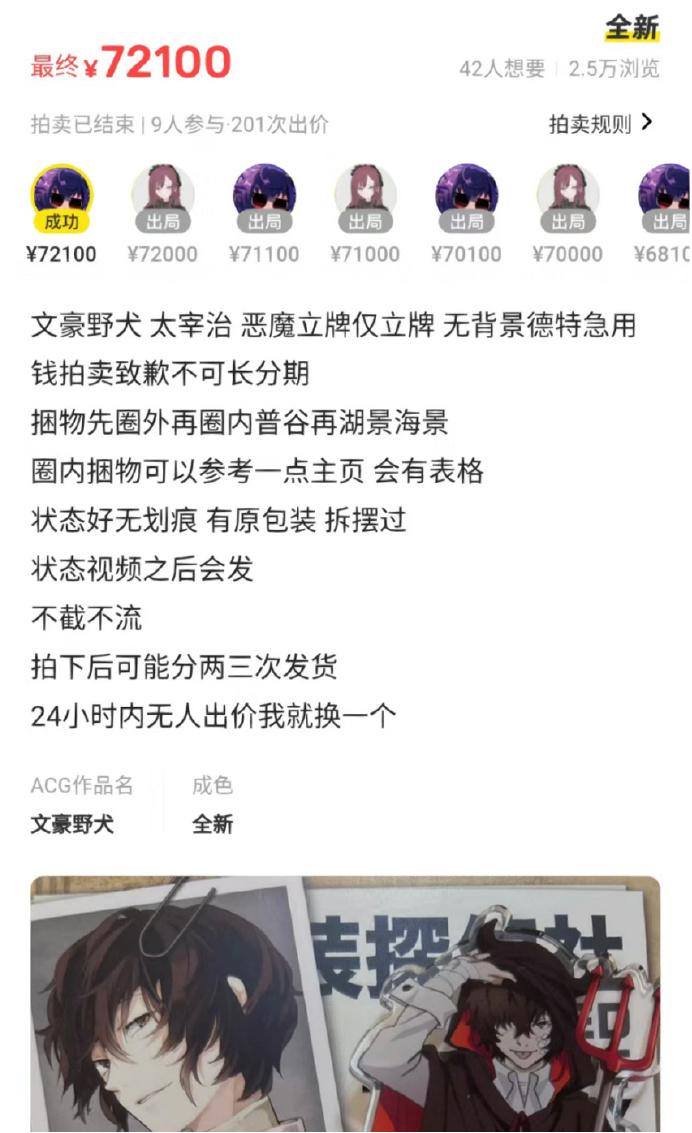 以米哈游的《原神》为例。天猫旗舰店的各种勋章(吧唧)产品销量都在10万甚至30万以上,店里的吧唧销量都在500万以上。也有爱好者以高价拍卖青睐的谷子,比如太宰治限量魔鬼立牌《文豪野犬》以7.21万元的成交价震惊了圈内圈外。
